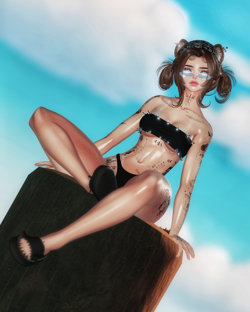 - Bikini, Body Chain, Corset, Heels, Skirt, Sleeves, Shark Slippers.